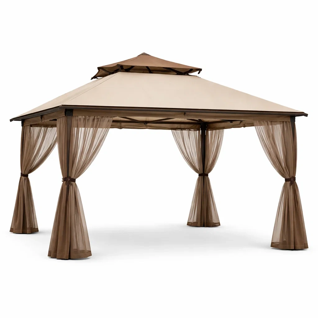 Gazebo in alluminio con copertura e tende in poliestere marrone e beige 300x300x270 cm