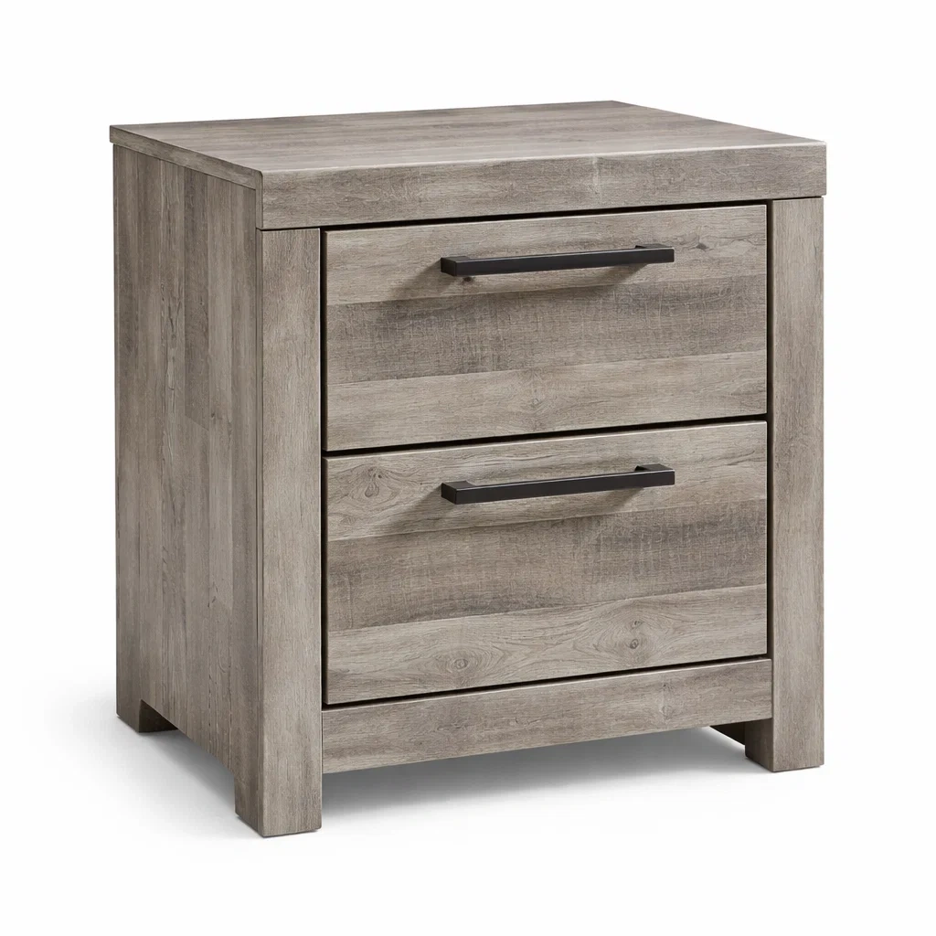 Questo comodino è realizzato in legno truciolare con finitura grigia. Dispone di due cassetti spaziosi con maniglie in metallo per un facile accesso.