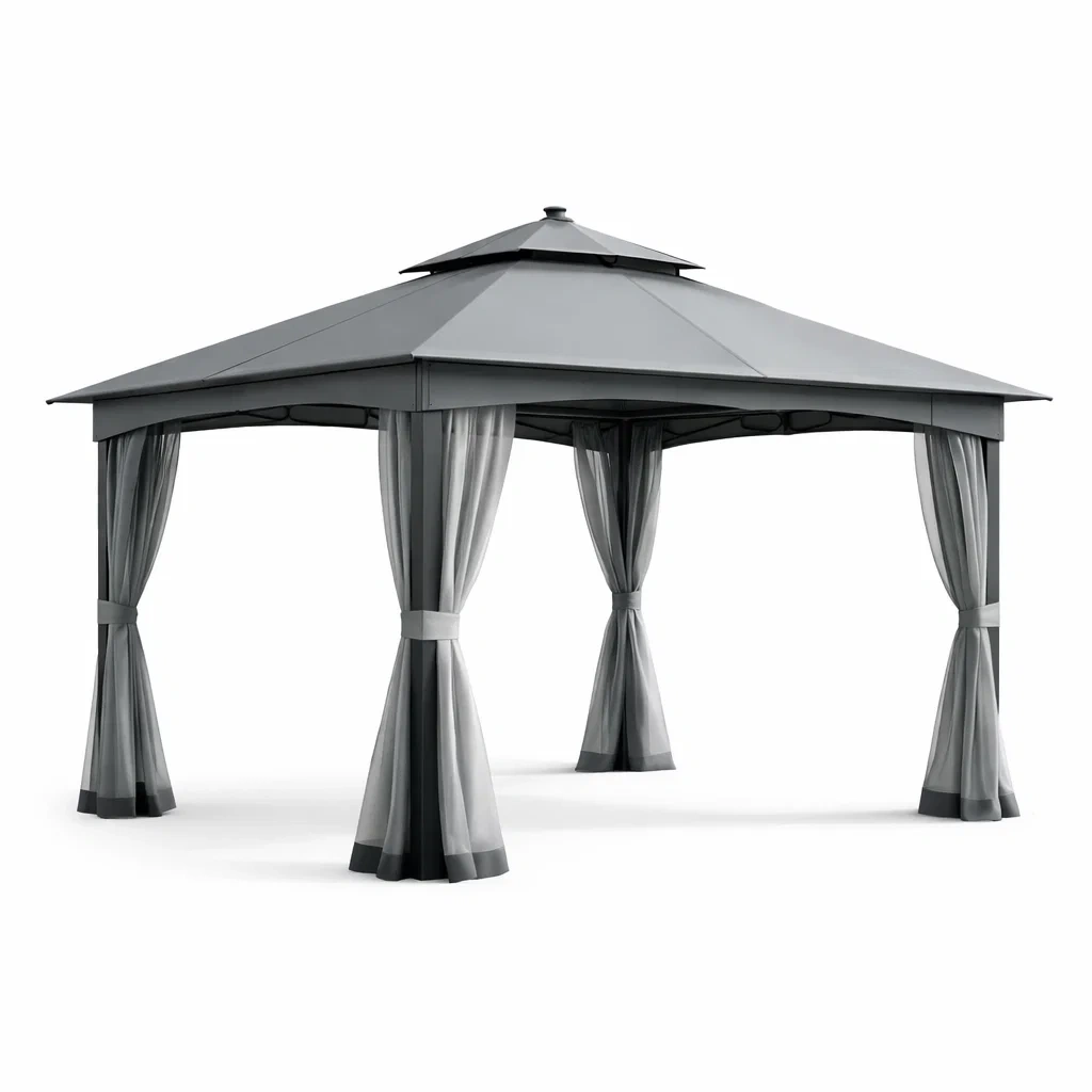Il gazebo presenta una struttura in acciaio robusta e un tetto in policarbonato. Le tende sono realizzate in poliestere resistente. Il colore principale è Grigio.